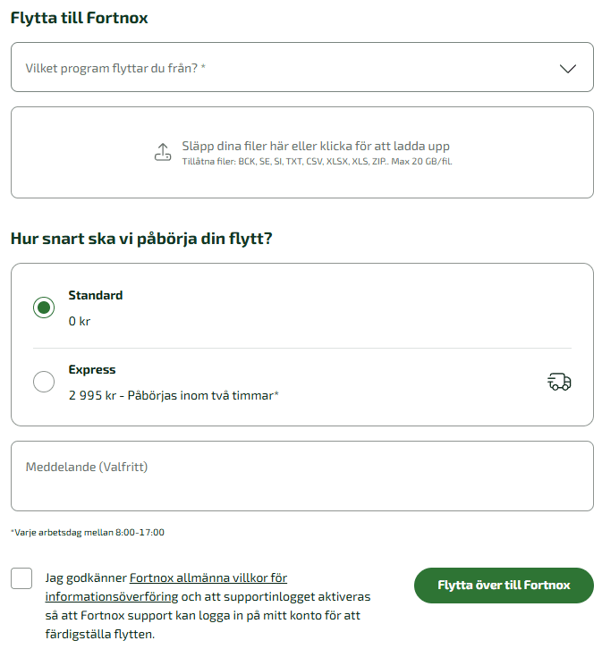 Det som kan påverka handläggningstiden, oavsett vilket paket man har valt, är hur mycket data som ska föras över, om datan är felaktig, eller om vi på Fortnox behöver invänta ett svar från kunden.