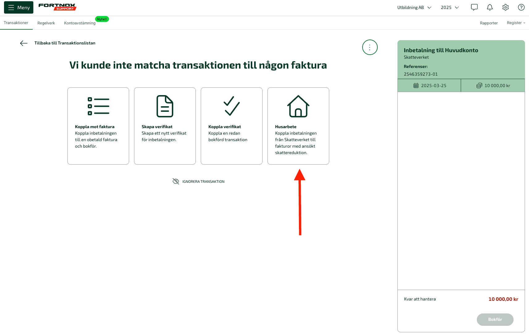 När du sedan tar emot inbetalningen från Skatteverket som avser den ansökta skattereduktionen kan även denna hanteras direkt i vyn Transaktioner. Denna typ av betalning hanteras via hanteringssätt Husarbete.