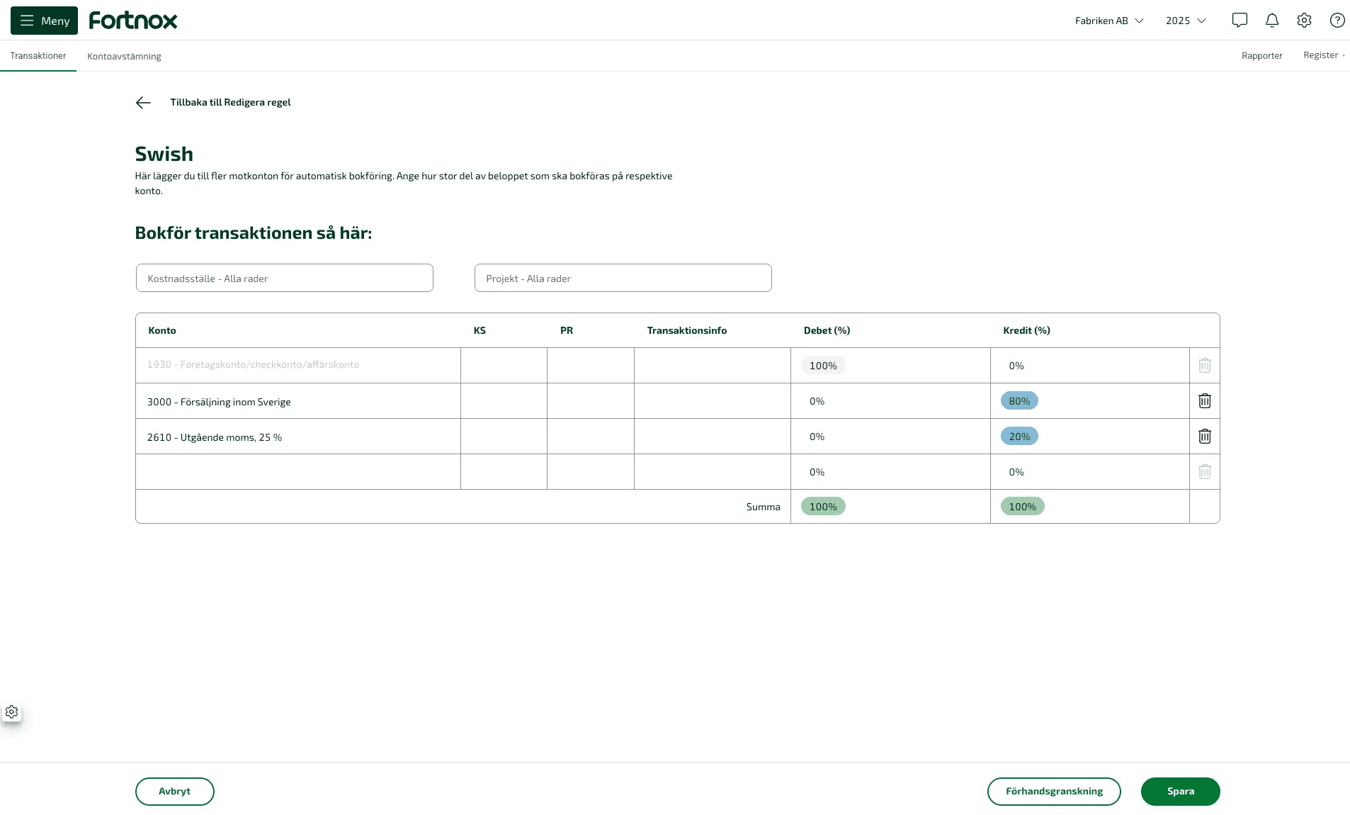 Automatkonteringar fördelar summan av transaktionen utefter dina inställningar och underlättar hanteringen av transaktioner med bestämda procentsatser och återkommande konteringsrader.