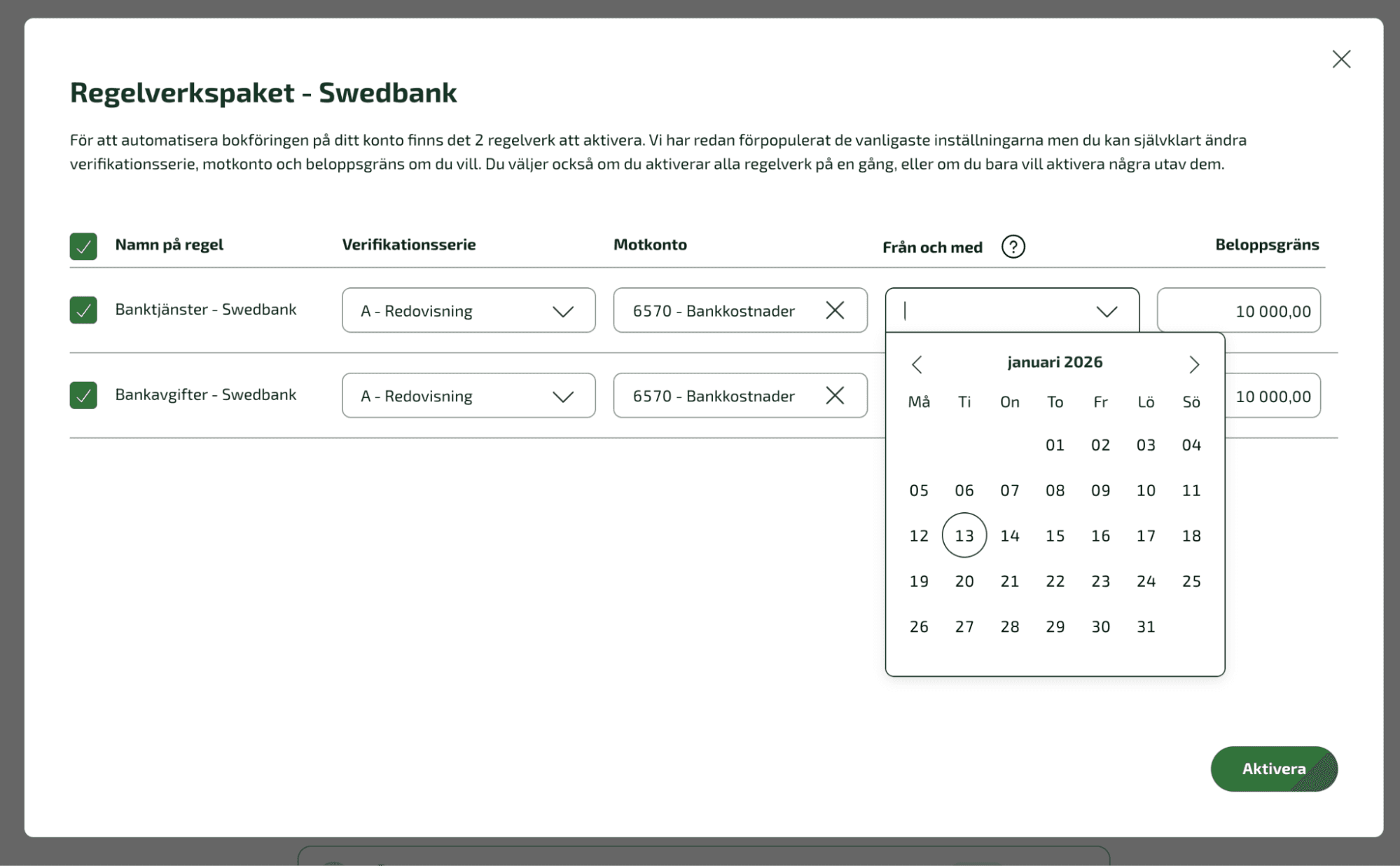 Vi har förifyllt de vanligaste inställningarna för varje regelverk – såsom verifikationsserie, motkonto och beloppsgräns – men du kan självklart anpassa dem efter dina behov. Du väljer själv vilka regelverk du vill aktivera och från vilket datum de ska börja gälla för dina transaktioner.