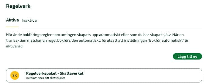 För att göra det ännu enklare att skapa ett automatiserat transaktionskonto finns det färdiga regelverkspaket som du kan aktivera. Du hittar dessa under Meny - Transaktioner - Regelverk.