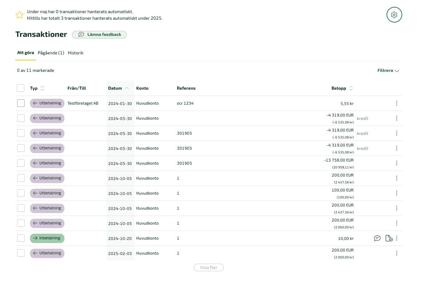 Nu har vi uppdaterat användargränssnittet i Transaktioner för att ge en tydligare överblick och möjliggöra enklare sortering. Istället för den tidigare listvyn presenteras nu transaktioner som behöver hanteras i en tabell.