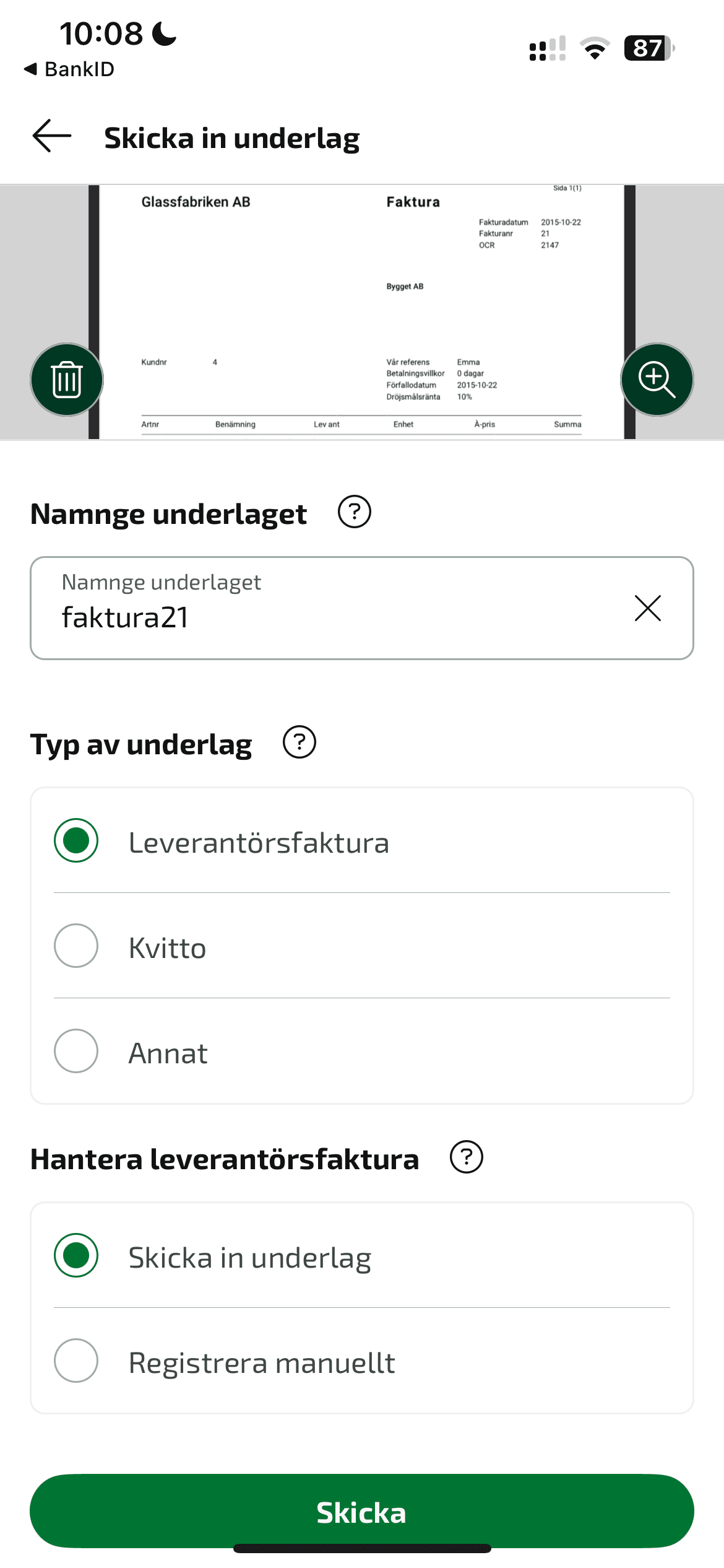När du har laddat upp bilden, välj Leverantörsfaktura som underlagstyp. Därefter får du två alternativ för hur fakturan ska hanteras: