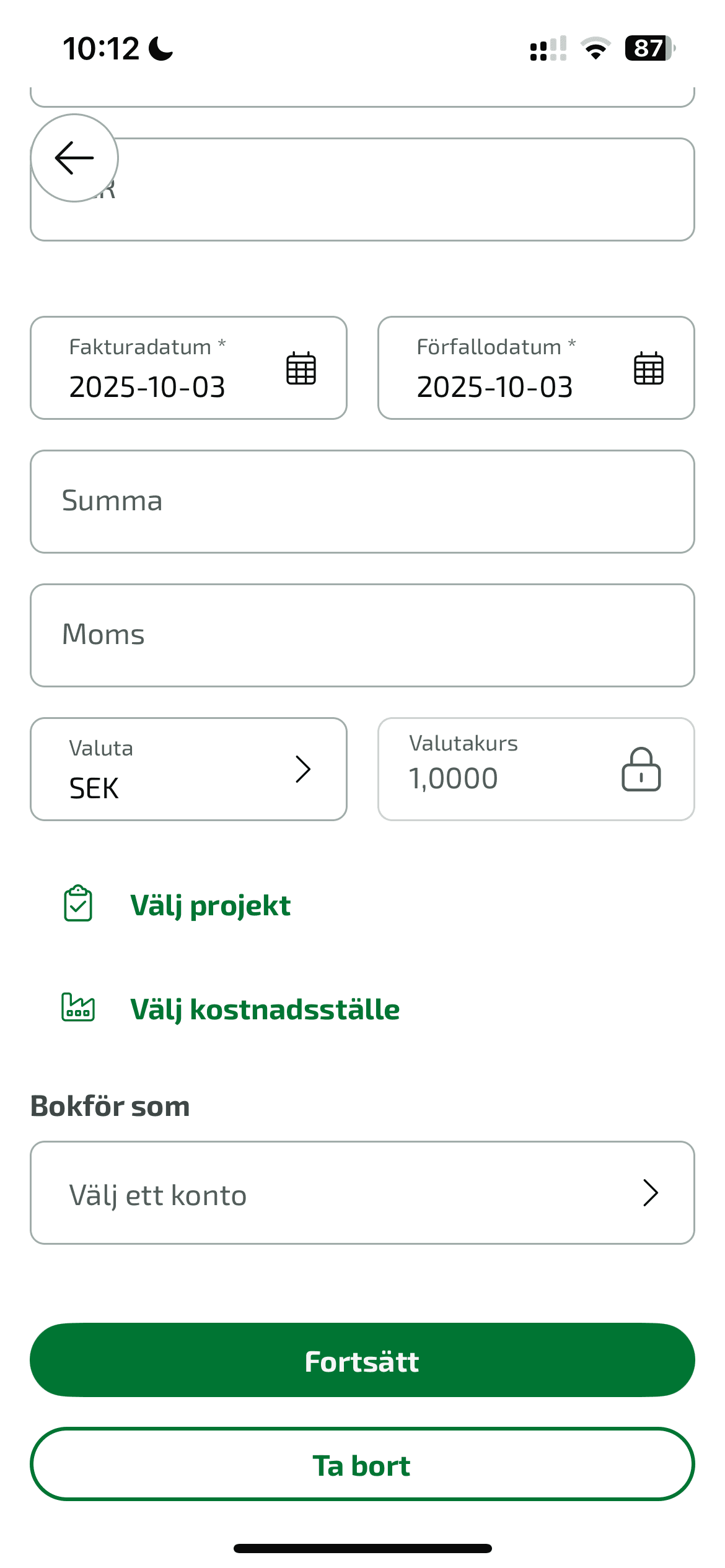 Väljer du Registrera manuellt kommer du få möjlighet att fylla i fakturans information på egen hand.