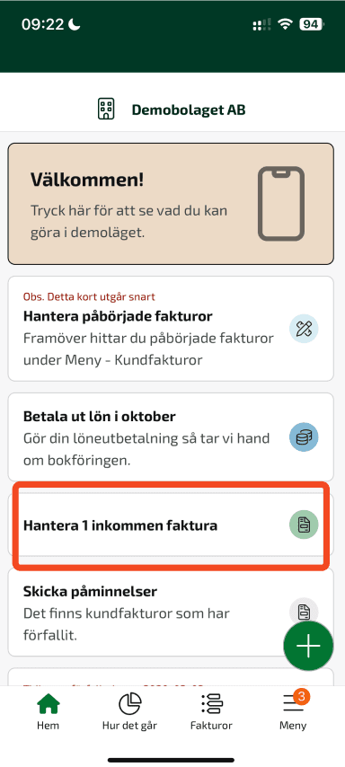 Om ovan inställning är igång och du väljer Skicka in underlag kommer Fortnox att tolka all information, som belopp och fakturadatum, åt dig, och fylla i denna information. När tolkningen är klar får du ett nytt meddelande i form av ett att göra-kort på appens startsida. Därifrån kan du sedan granska och bokföra fakturan.