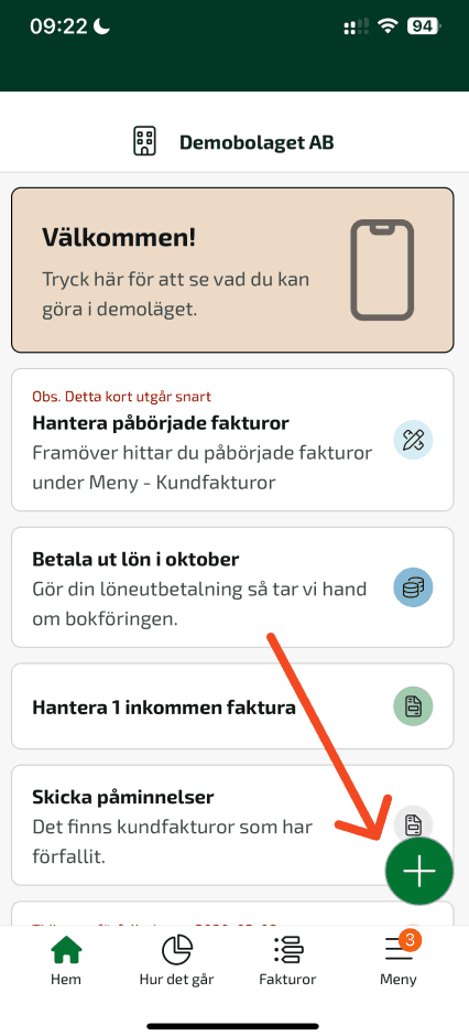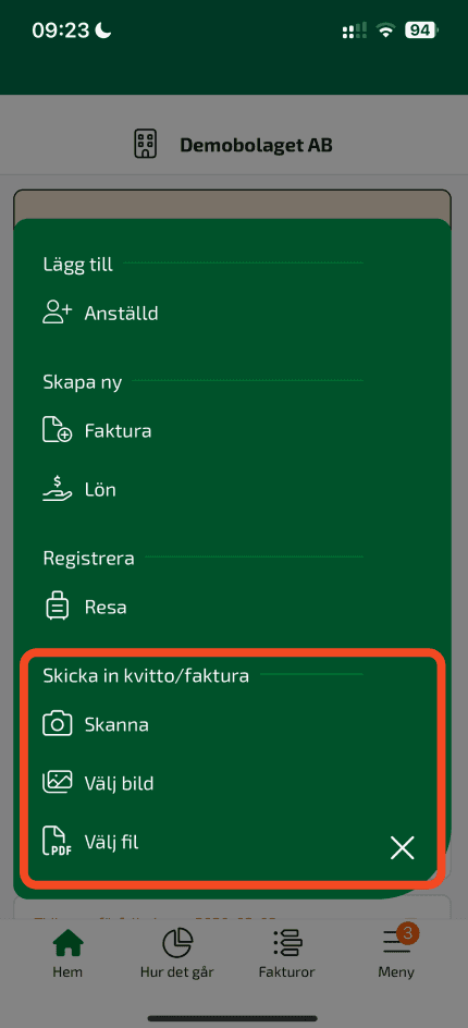 Börja med att ladda upp fakturan. Tryck på plustecknet i högra hörnet och välj sedan att “Skicka in kvitto/faktura”, därefter: