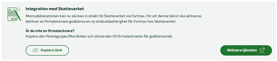 För att ge Fortnox ombudsbehörighet kan du vid inlämningssteget klicka på knappen Aktivera tjänsten eller vidarebefodra länken som finns under Kopiera länk. Tänk på att det är firmatecknaren som måste godkänna ombudsbehörigheten.