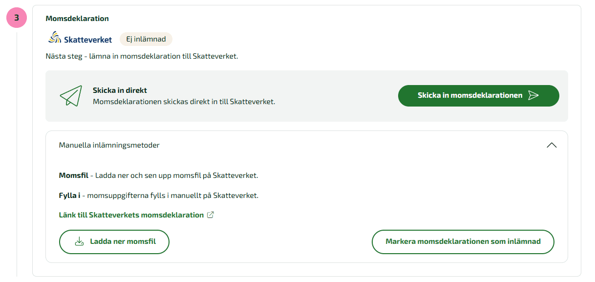 Efter att du valt att bokföra din momsrapport kan du välja att skicka in momsdeklarationen direkt till Skatteverket eller genom att välja manuell inlämningsmetod.