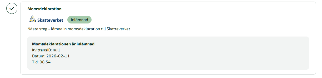 För att skicka in momsdeklarationen väljer du Skicka in momsdeklarationen och underlaget skickas in.