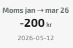 Beskrivning: Visar din aktuella momssituation baserat på vad som hittills är bokfört. En positiv siffra är en skuld, medan en siffra med minustecken innebär att du har moms att få tillbaka.