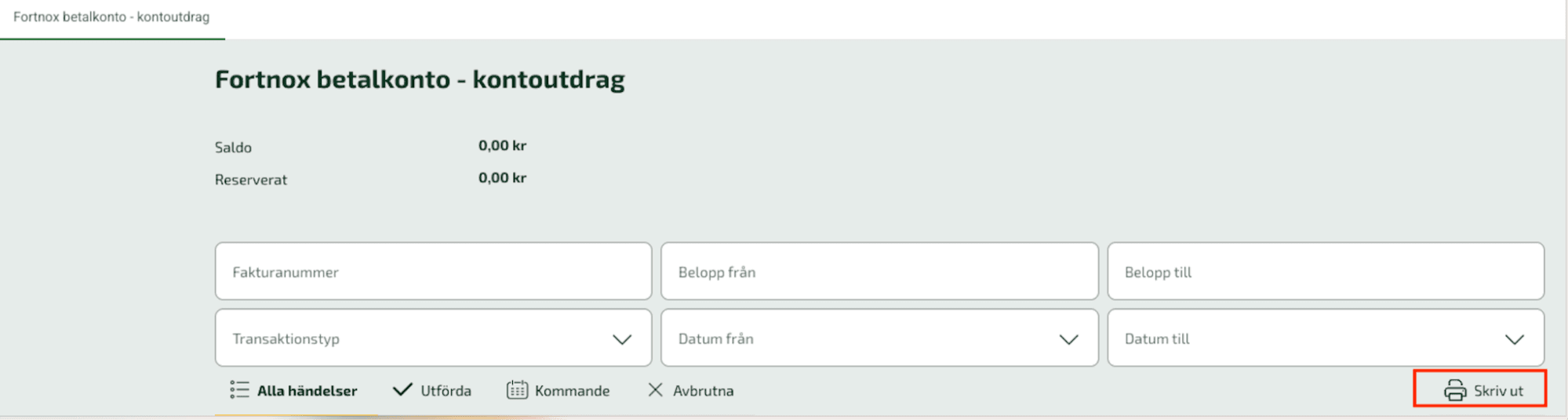 Du kan spara ner eller skriva ut ditt betalkonto kontoutdrag genom att klicka på knappen Skriv ut uppe till höger under sökfälten. Vill du enbart spara ner eller skriva ut specifika transaktioner, kan du filtrera kontoutdraget på ett specifikt datum eller en transaktionstyp, och därefter klicka på knappen Skriv ut.