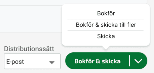 Önskar du att skicka fakturan till fler E-postadresser klickar du på pilen bredvid Bokför & skicka knappen. Här kommer det upp ett alternativ som heter Bokför & skicka till fler.