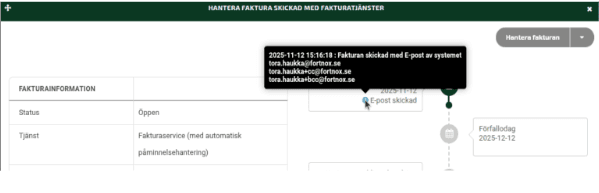 För att se vilka e-postadresser fakturan skickats till klickar du på knappen Visa historik & fler val uppe till vänster inne på fakturan, sväva över info “i” bredvid E-post skickad för att få fram e-postadresserna.