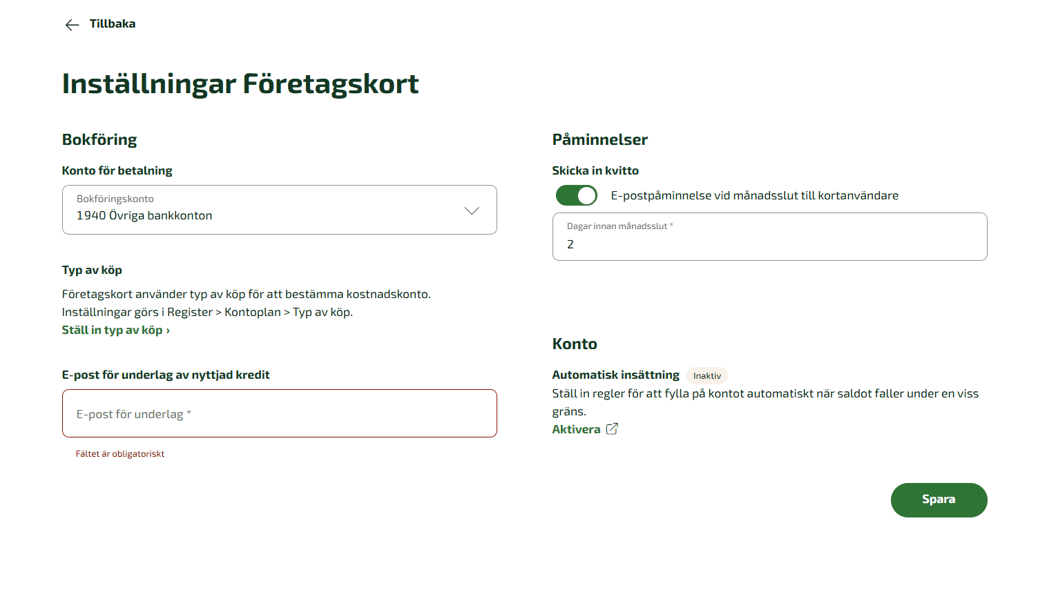 Här anger du vilket bokföringskonto du vill att köpen med företagskortet ska bokföras på.