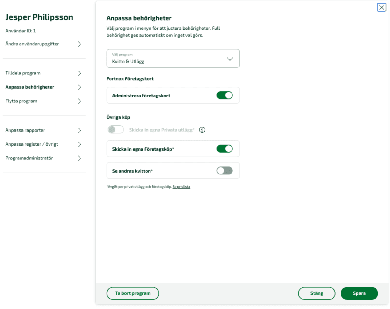 Behörigheter Fortnox Kvitto & Utlägg