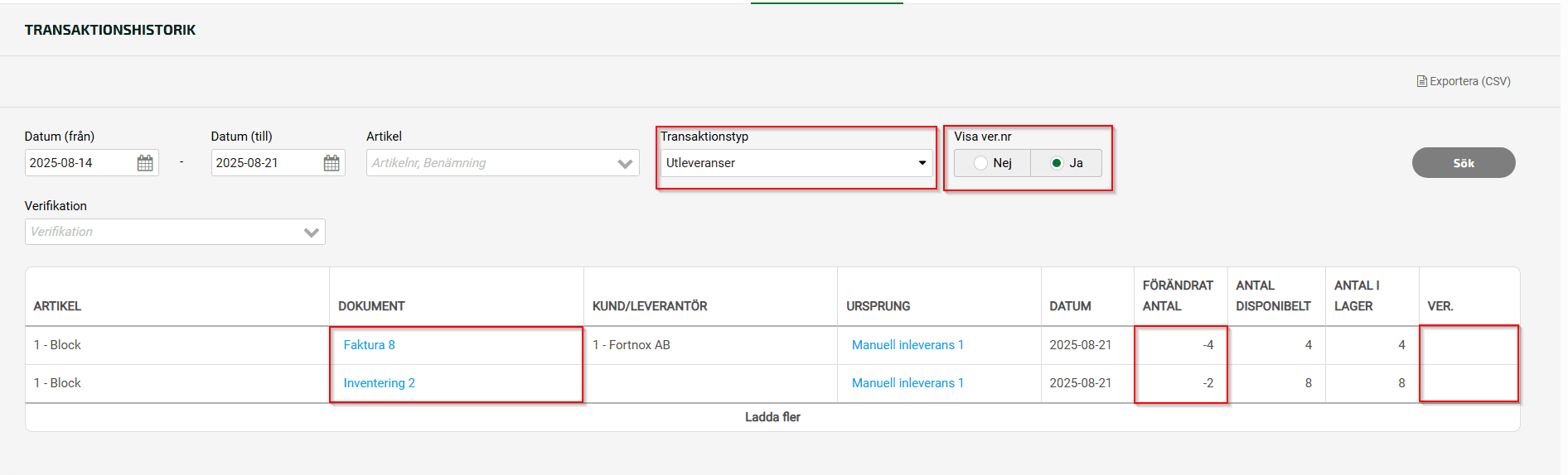 De rader som inte har något verifikationsnummer i kolumnen ver. behöver ses över. Du kan enkelt klicka på dokumenten under Dokument och Ursprung för att direkt ta dig till dokumentet som påverkat lagersaldot. Vid klick öppnas en ny flik i webbläsaren så att du inte behöver lämna den tidigare vyn.