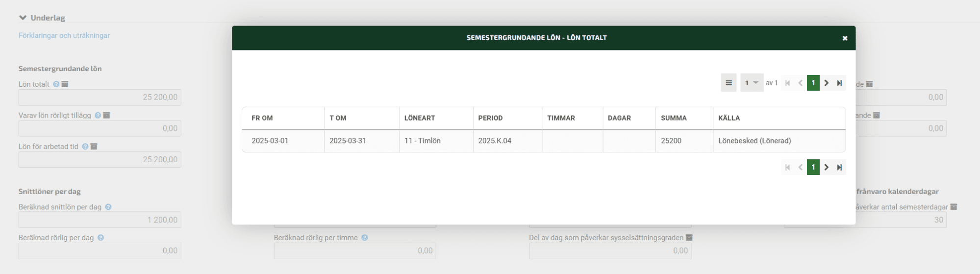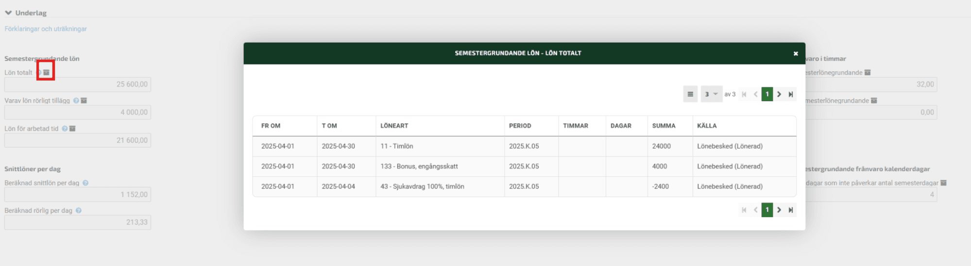 I arkivlådan som finns vid de olika fälten i underlaget för semesterberäkningen kan du alltid se vilka värden som hämtats och från vart de kommer.
