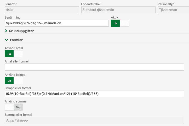 På löneart 4434 - “Sjukavd 90% hel månad <180 dgr månadslön” görs ett avdrag på 90% när den anställde är sjuk hela månaden efter dag 15- under så många dagar som angetts under Inställningar - Lön - Ersättningar - Extra sjukersättning t.o.m dag. Ska lönearten ta hänsyn till löner som är högre än 10*prisbasbeloppet behöver man lägga in följande formel på lönearten.