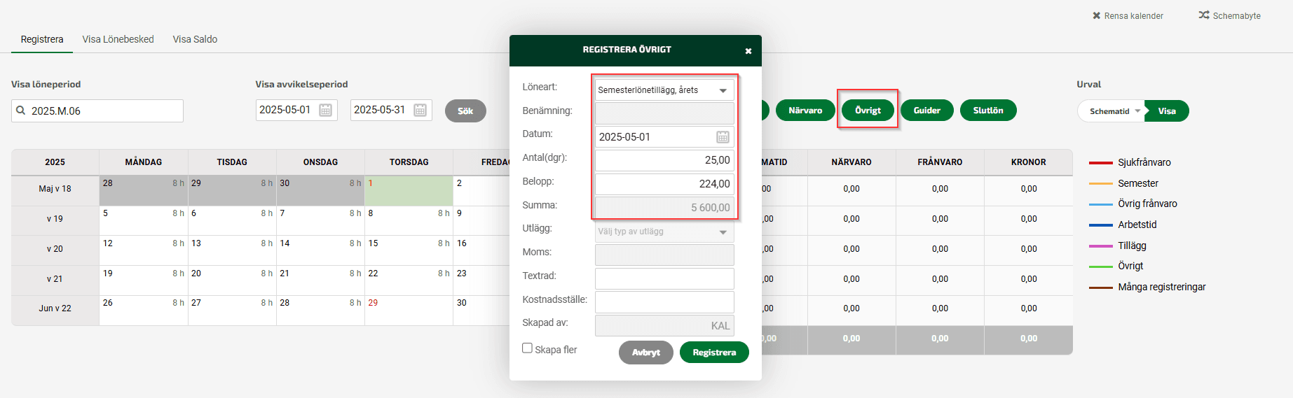 Gå till Meny - Lön - Kalender och klicka på en av de anställda som ska få semestertillägget utbetalat. Under Övrigt väljer du löneart Semesterlönetillägg, årets, välj ett datum inom den avvikelseperiod som gäller för den löneutbetalning som du vill ha semestertillägget utbetalt på. Vill du att semestertillägget ska betalas ut på junilönen och ni har föregående månad som avvikelseperiod så välj ett datum i maj månad på registreringen. Fyll därefter i det antal betalda dagar som den anställde har att få ut semestertillägg för.